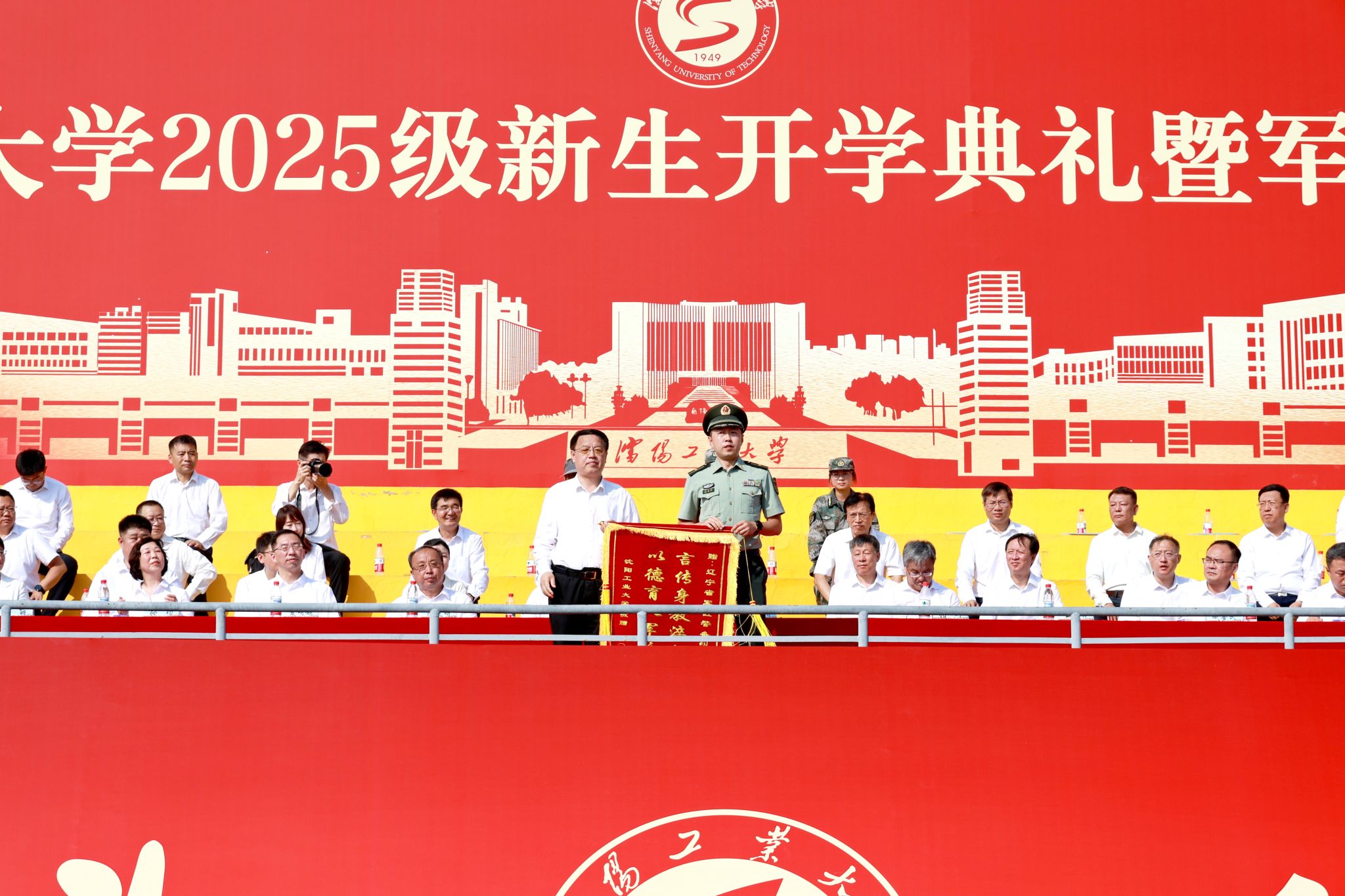 典礼现场,贾玉明为2025级新生代表授旗。这面承载着学校历史与荣耀的旗帜,在新一代“工大人”手中完成了庄严的传递,也象征着学校精神血脉的延续与传承。